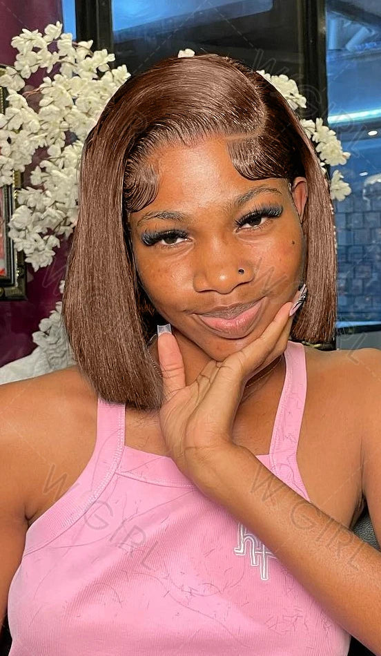 Achieve a sleek and professional look with the Short Straight Bob Wig, crafted from 100% human hair. This wig features transparent Swiss lace for a seamless, natural hairline that blends perfectly with all skin tones. With a length range of 4-16 inches, this stylish bob is lightweight, easy to style, and perfect for everyday wear or special occasions.
